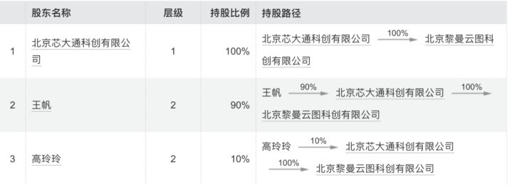 股权穿透可见,北京芯大通科创有限公司直接持有黎曼云图100%的股权,王帆直接持有芯大通科创90%的股权,为其控股股东、实际控制人。
