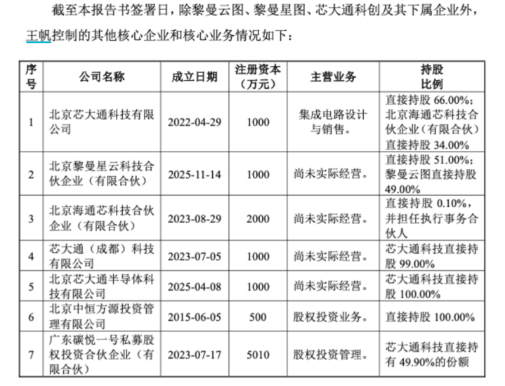 据公告披露,王帆,男,1991年11月出生,主要从事互联网及人工智能行业。其从2022年开始创业,2025年3月至今担任黎曼云图董事、经理、财务负责人;2025年11月至今担任北京黎曼星云科技合伙企业(有限合伙)、黎曼星图执行事务合伙人。此外,王帆还在北京芯大通科技有限公司、芯大通(成都)科技有限公司、北京中恒方源投资管理有限公司等7家公司任职。